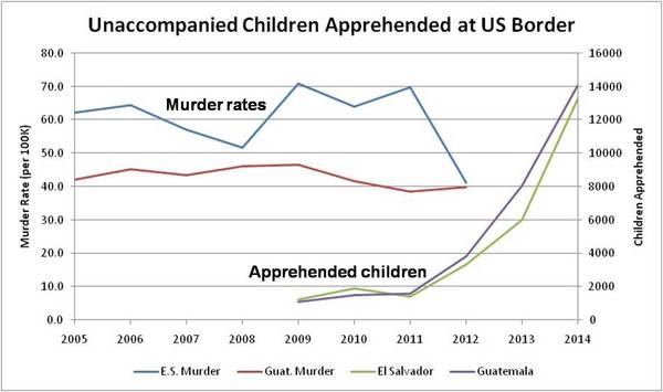 The War On Drugs has been with us since 1970. The Wilberforce Act became law in 2008. The murder rates in El Salvador and Guatemala were declining from 2005 through 2012. Yet the number of children crossing the border was fairly low and steady through 2011 -- a full three years after the 2008 law.