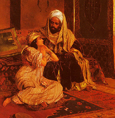From a seraglio painting by Austro-French painter Rudolf Ernst (1854-1932). Ernst called it "The Favorite of the Farm," but for the sake of illustration, we have retitled it, "Muhammad with the Wife of his Adopted Son."